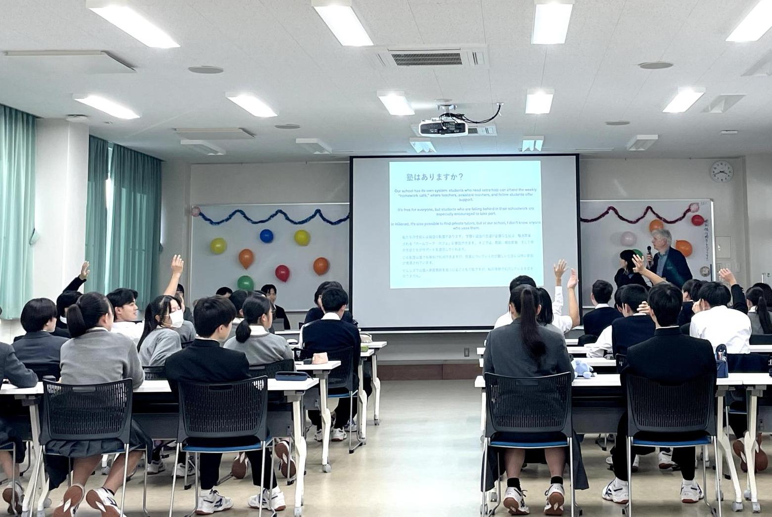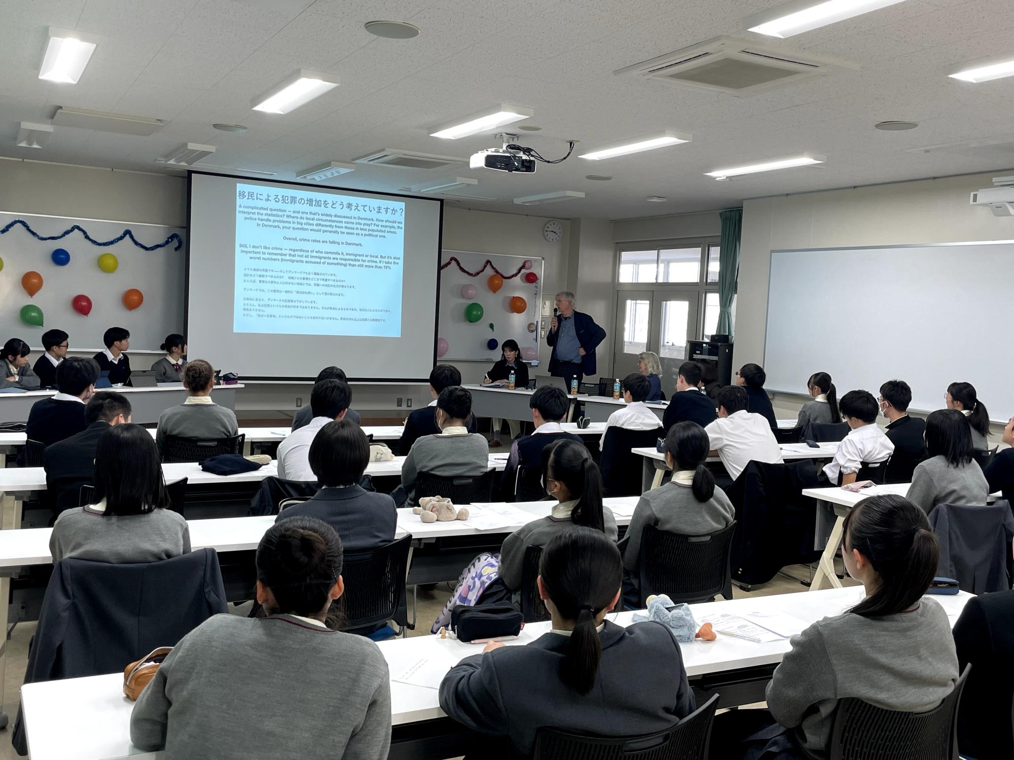 デンマーク社会が抱える移民受け入れの問題や、若者が犯罪ビジネスに利用される社会課題(日本の闇バイト問題に類似)についても紹介がありました。「民主主義が発展しているデンマークでは、マイノリティはどのように受け入れられているのか?」という生徒からの質問も飛び出し、両国の共通点と違いに関心を寄せながら、積極的に対話を深める姿が見られました。