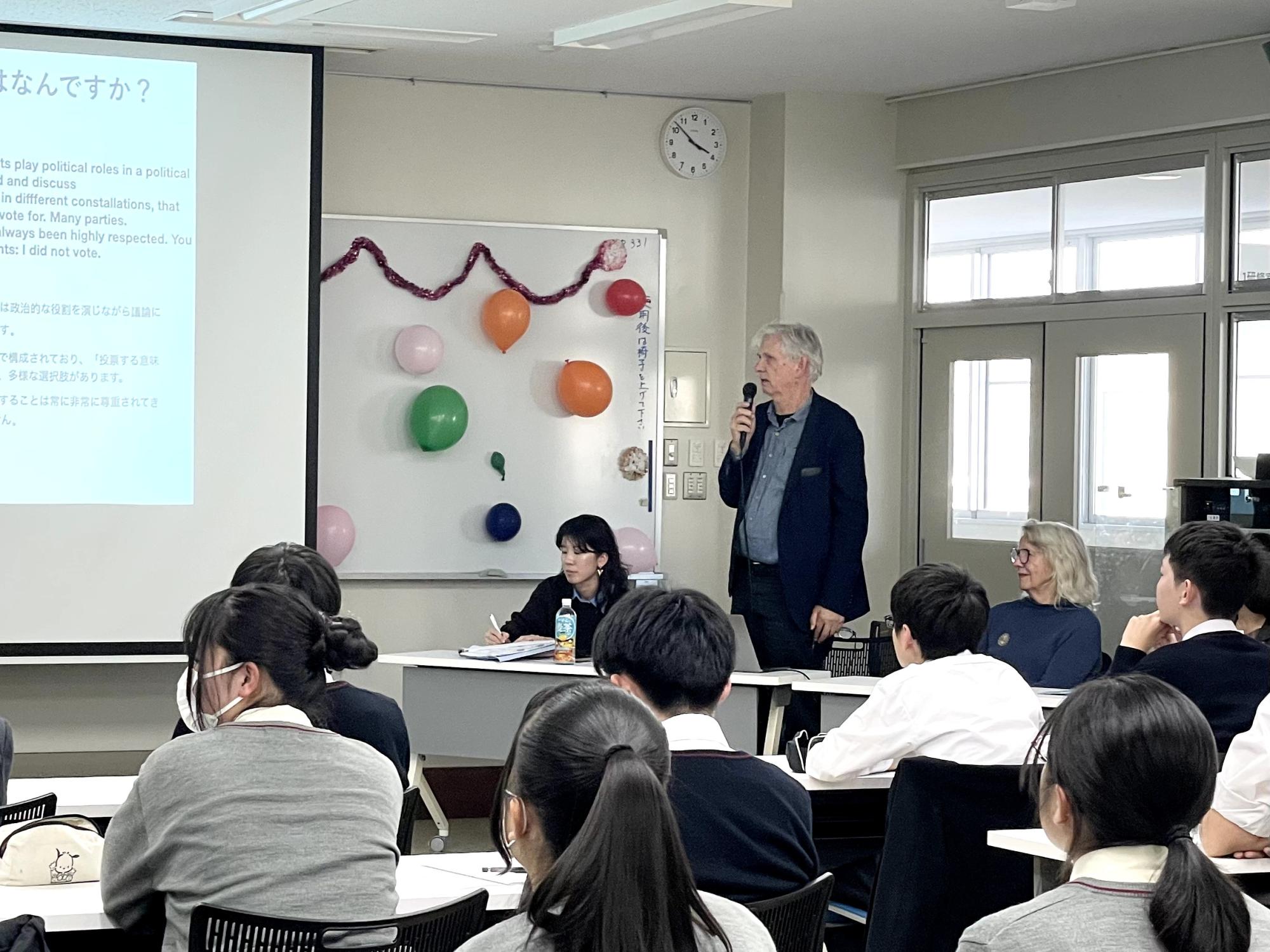 世界の民主主義を学び、未来の姿を描く、リーダー育成プログラム「Voice of the Future(VOF)」。今回は本校に、デンマークの工科高校 Unord HTX Hillerød のマート先生、そして元高校教師のブリット先生をお迎えし、生徒主体の学びと社会のあり方をテーマに交流を行いました。