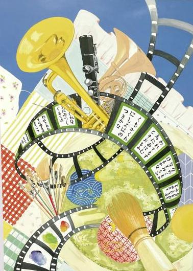 文化の祭典を象徴するように、多彩な個性と創造性が織りなすハーモニーを鮮やかに表現。それぞれの表現が響き合い、文化祭という「創造の場」の楽しさと躍動感が描かれています。