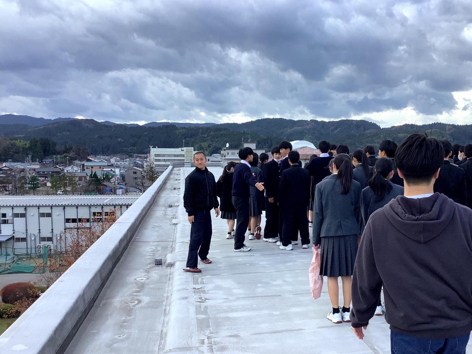 訪問した輪島高校では、震災の爪痕の残る校舎の中を実際に見せていただき、寒風が吹き付ける中、屋上に立ちました。今も傾いたままの校舎。震災後1年以上にわたりこの傾いた校舎の中で、私たちと同じ高校生が学びを継続してきたことを知りました。