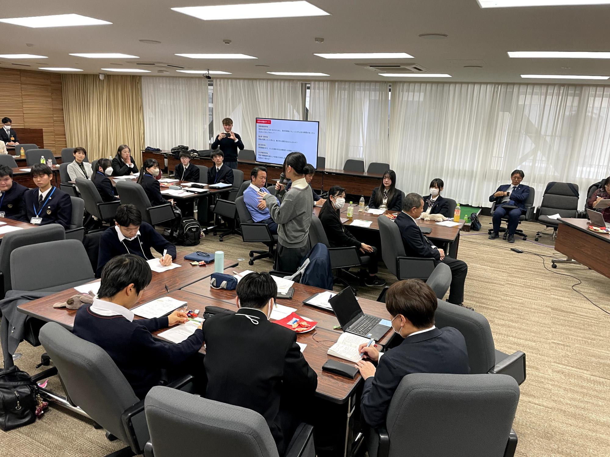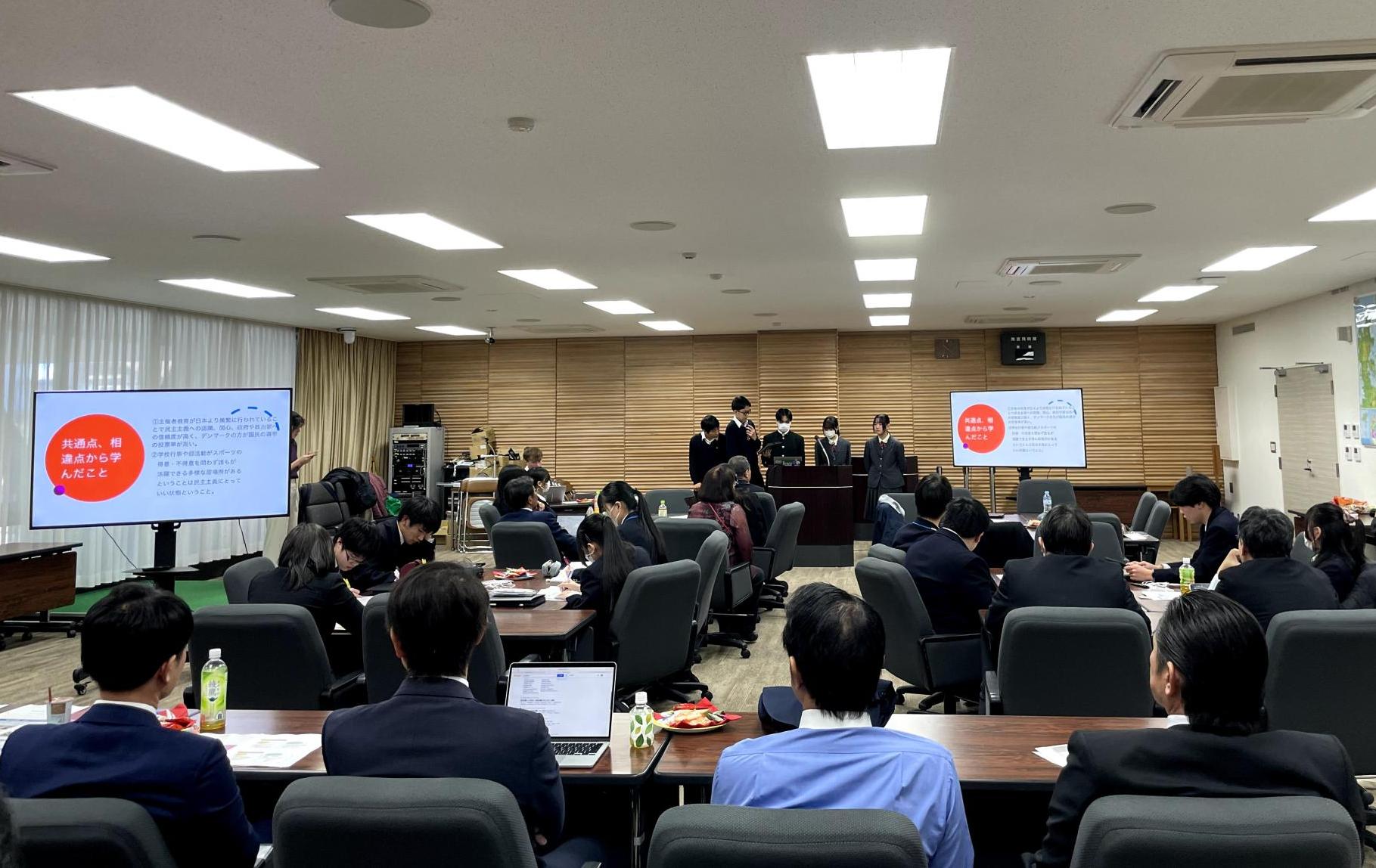 各学校で設定した探究テーマについて、県内4校の高校生が集まり、県議会議員6名の前で探究成果発表と課題の提言をおこないました。「若者が投票したいと思える、魅力的な投票方法とは何か。」これがチームTOMIICHIの設定した問いです。学校ごとに異なる切り口や視点に刺激を受け、課題を複眼的に捉える気づきがありました。