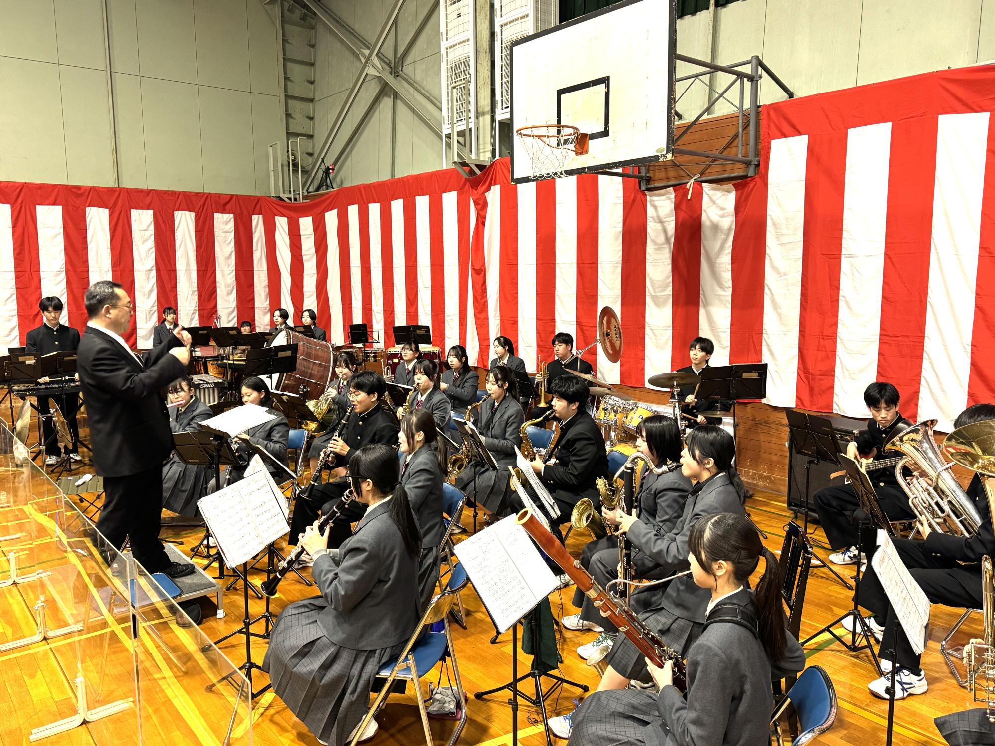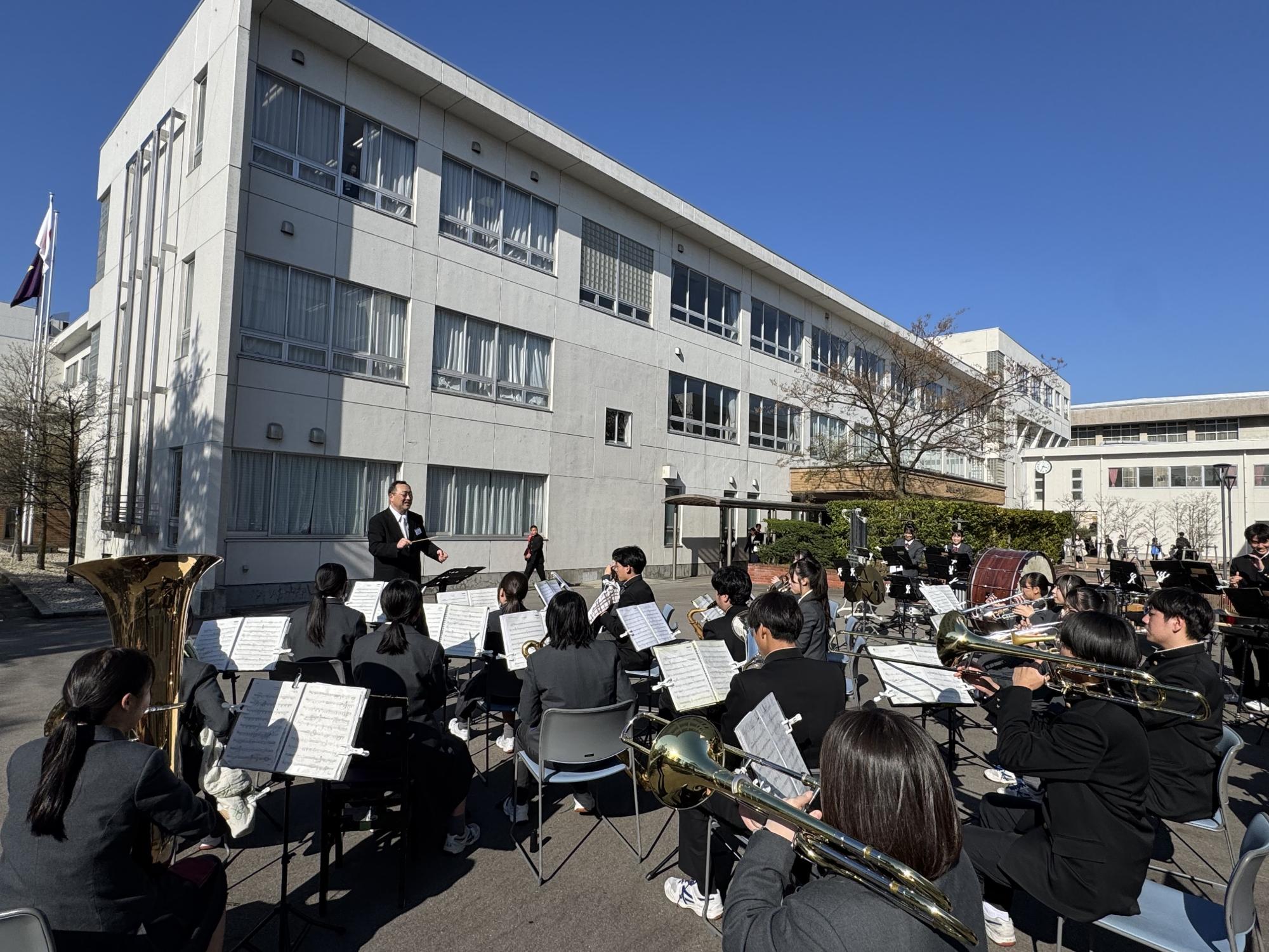 入学式後は、澄み切った青空の下、吹奏楽部が新入生祝福の青空演奏を行いました。