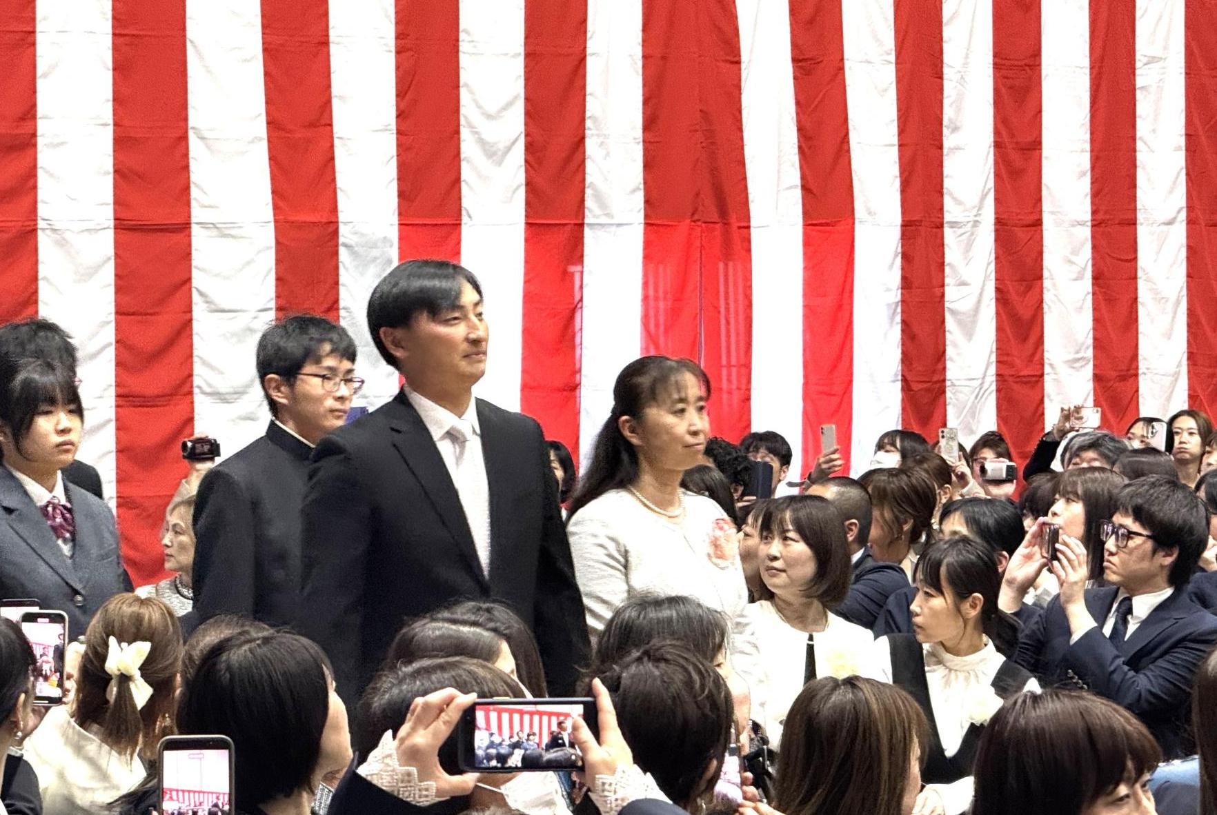 吹奏楽部の演奏、Mrs. GREEN APPLEの「ケセラセラ」にあわせて新入生は笑顔で退場。軽快な音楽がこれから始まる高校生活への期待を後押しし、在校生からの歓迎のメッセージを届けていました。